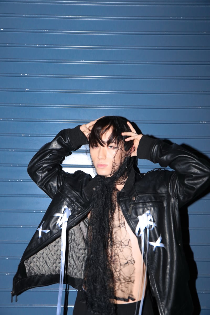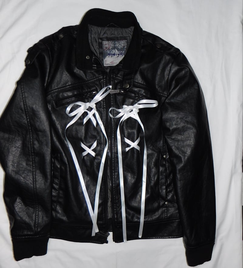 FA leather jacket with ribbon embellishments on the front. As well as a 8x8 punk guy patch on the back. Large in MENS.