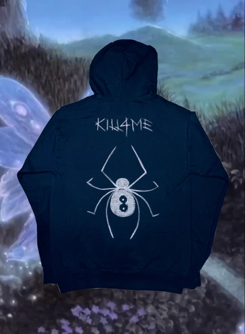 This Fairy Angel design was created back in fall 2021. This design has a heart web in the front with a kill4me lucky #8 spider on the back. Each sweater completely is hand painted with bleach. Fairy Angel provides inclusive sizing from Small up to 3XL in mens hoodies.